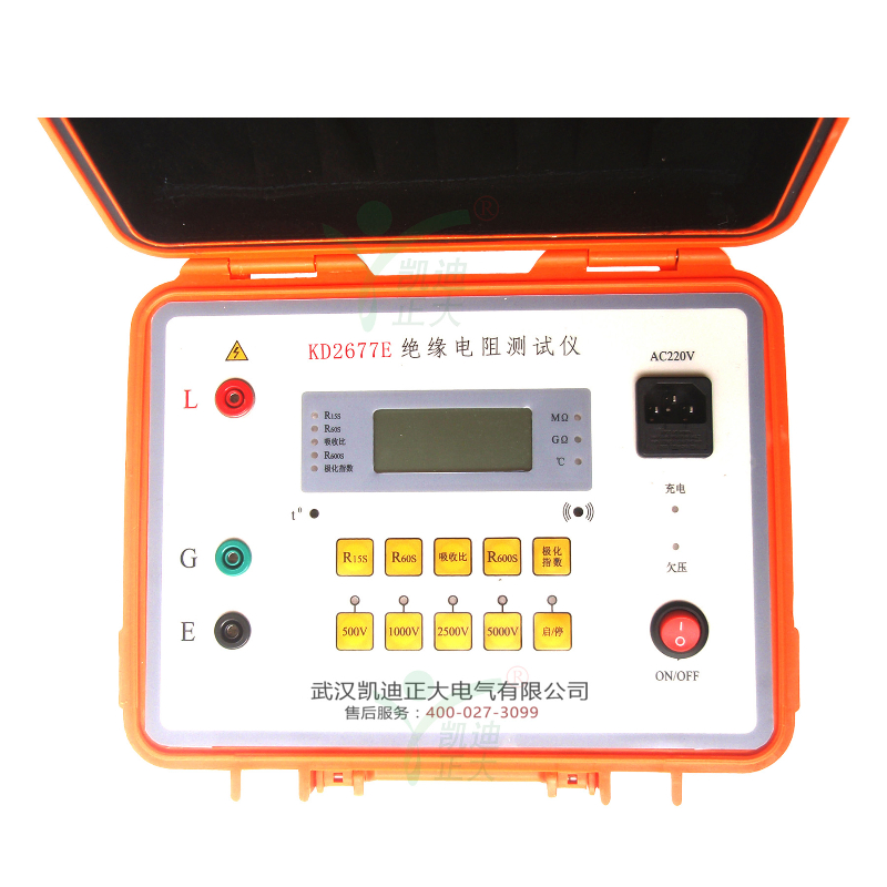 KD2677E高壓絕緣搖表是根據(jù)絕緣電阻測(cè)量的基本要求,采用較新電子電路設(shè)計(jì)而成的,其基本原理是采用電壓、電流法測(cè)量被測(cè)物的電阻值:R=V/I。機(jī)內(nèi)的存儲(chǔ)、運(yùn)算電路使本機(jī)可自動(dòng)測(cè)量吸收比(R1min/R15s)和極化指數(shù)(R10min/R1min)。