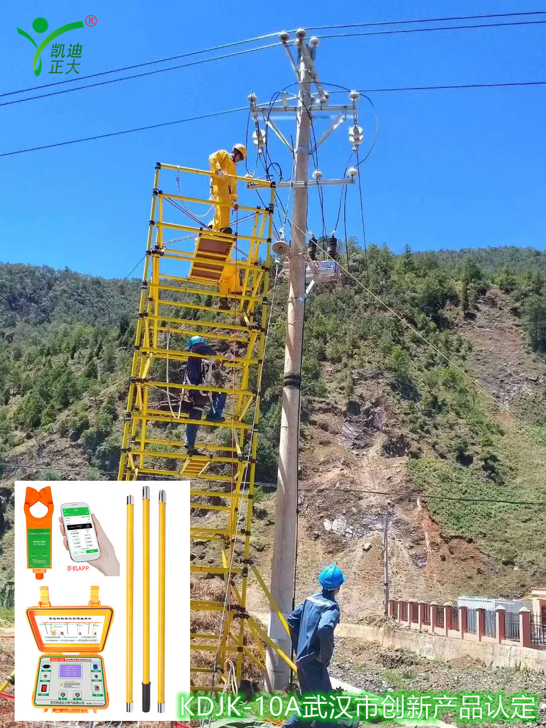 首先將故障線路的開關斷開;使用KDJK-10A測試地線用接地線與接地棒連接,接地棒接入大地網(wǎng);信號輸出端子與高壓輸出測試線插頭端子連接,其另一端的線鼻子壓擰在接在絕緣掛線桿的蝴蝶母接線柱上,3根絕緣桿用短接線連接,再將掛線桿掛在故障線路上。