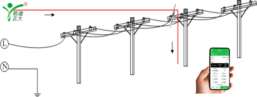 KDJK-10A二分法的運用:① 在故障線路中間位置塔桿兩側檢測信號電流,通過采集器測量到的信號后,將在接收器上顯示故障是在上游還是在下游。若在塔桿輸入/輸出兩側側均為上游,則表示故障在信號靠近的主機側;若在塔桿輸入/輸出兩側側均為下游,則表示故障在信號遠離主機側;若在塔桿輸入側為下游,輸出側為上游,則表明故障就在此處。②若在上述檢測后,確定故障在下游,則在下游線路中間位置進行第二次測量,并重復上述的測量過程,然后逐步縮小故障范圍后,直至找到故障點位置。