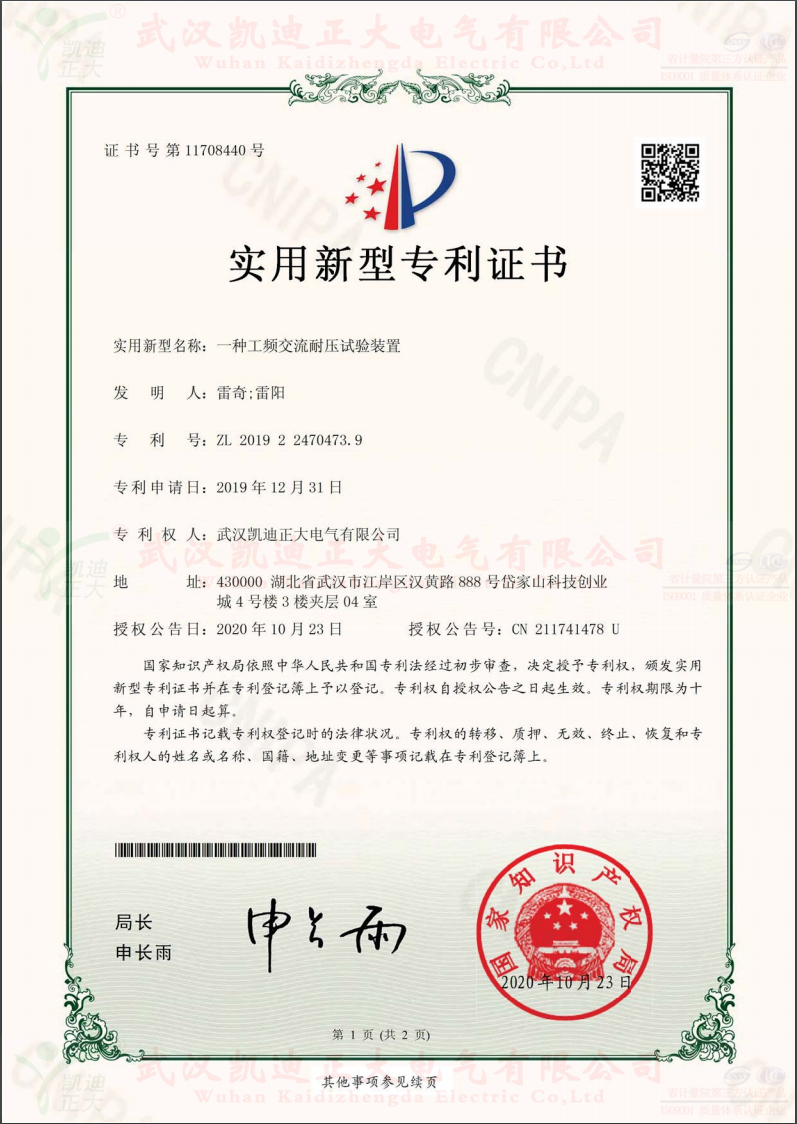 3、一種工頻交流耐壓試驗裝置。證書號第11708440號,專利號:ZL 2019 2 2470473.9,發(fā)明人:雷奇;雷陽,專利權人:武漢凱迪正大電氣有限公司,授權公告號:CN 211741478 U。