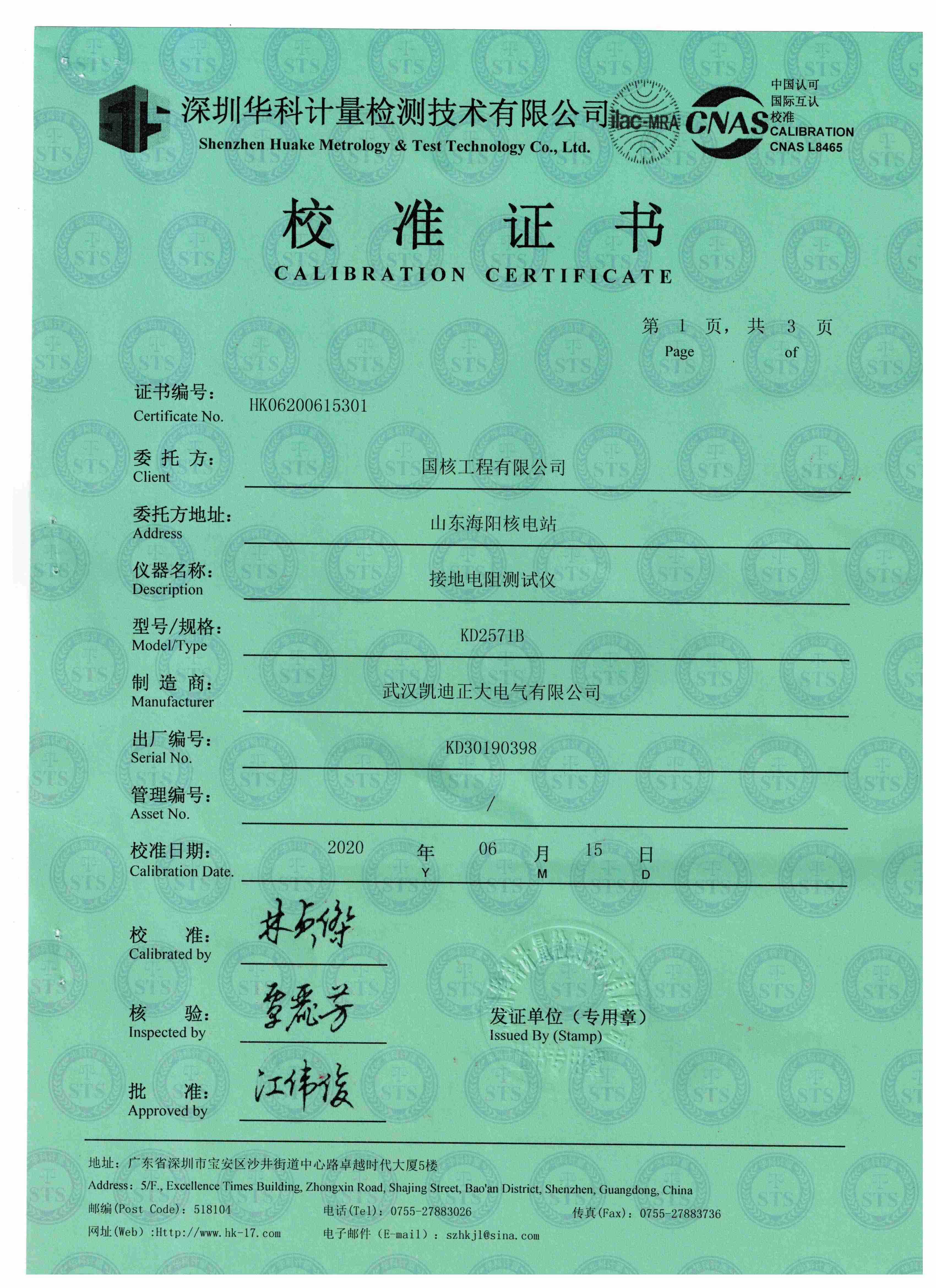 海陽(yáng)核電購(gòu)置KD2571B接地電阻測(cè)試儀獲得校準(zhǔn)證書(shū)