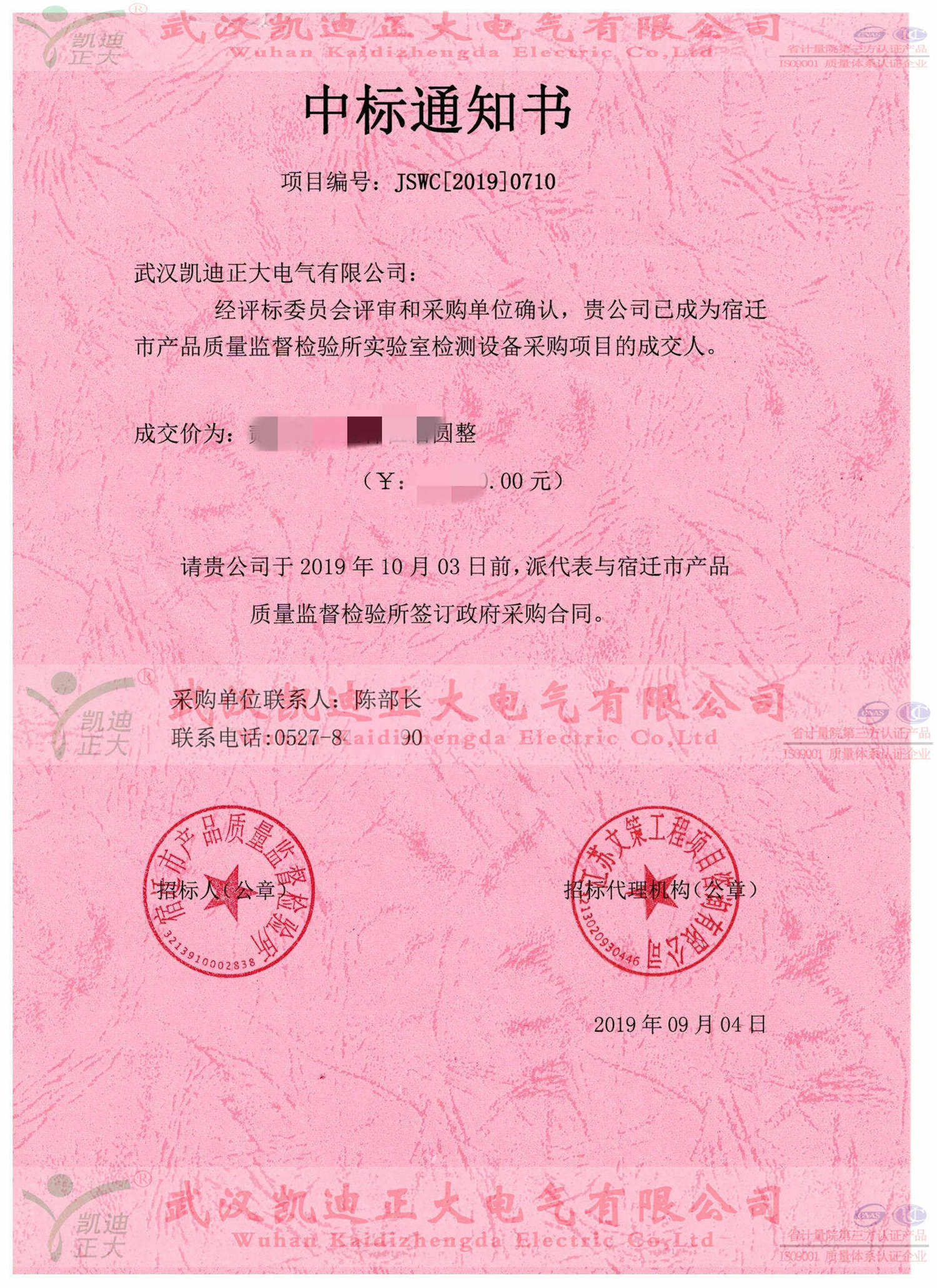 2019年9月份,受邀參與隸屬于宿遷市質(zhì)量技術(shù)監(jiān)督局的宿遷市產(chǎn)品質(zhì)量監(jiān)督檢驗所實驗室檢測設(shè)備采購項目,并以最高分獲得中標(biāo)人。因武漢疫情等影響昨日收到宿遷質(zhì)檢所的中標(biāo)通知書。