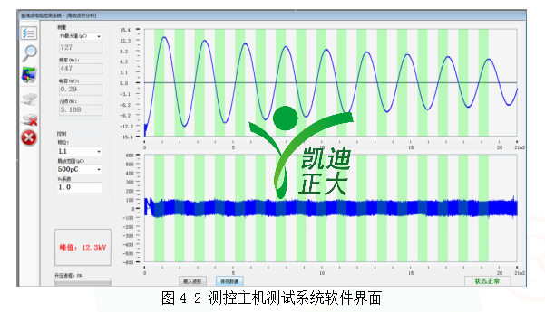 測控主機(jī)協(xié)調(diào)整個系統(tǒng)的運(yùn)行,通過無線網(wǎng)絡(luò)控制高壓恒流源升壓蓄能,控制高壓固態(tài)開關(guān)閉合并采集、存儲和分析分壓器/耦合器采集的局放振蕩波信號和局放信號。測控主機(jī)運(yùn)行的測試系統(tǒng)軟件界面如圖4-2。