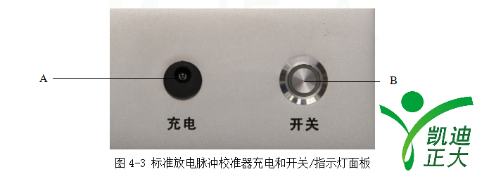 標(biāo)準(zhǔn)放電脈沖校準(zhǔn)器內(nèi)置鋰電池,充電和開關(guān)/指示燈面板如圖4-3所示: