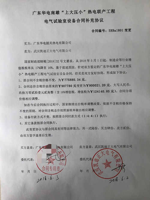 國家財政部財稅[2018]32號文要求,從2018年5月1日起,制造業(yè)等行業(yè)增值稅稅率從17%降至16%。基于前述原因,針對雙方簽定的廣東華電南雄“上大壓小”熱電聯(lián)產(chǎn)工程電氣試驗室設(shè)備合同,經(jīng)買賣雙方友好協(xié)商,形成如下協(xié)議: