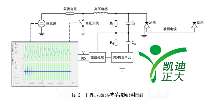 阻尼振蕩波狀態(tài)檢測技術是近年來國內外密切關注的一種用于電力電纜狀態(tài)檢測的新興技術,其技術實質是用阻尼振蕩波電壓代替工頻交流電壓作為測試電壓,在此基礎上緊密結合符合IEC60270標準要求的脈沖電流法局放現(xiàn)場測試、基于時域反射法的局放源定位和基于振蕩波形阻尼衰減的介質損耗測量多種手段。圖21為其原理框圖。