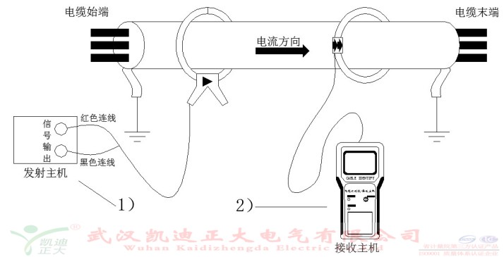 1)發(fā)射主機準備:將卡鉗卡入電纜,接線柱按顏色接入發(fā)射主機,開關(guān)置于“帶電識別”檔位,“輸出指示”閃亮則輸出正常;