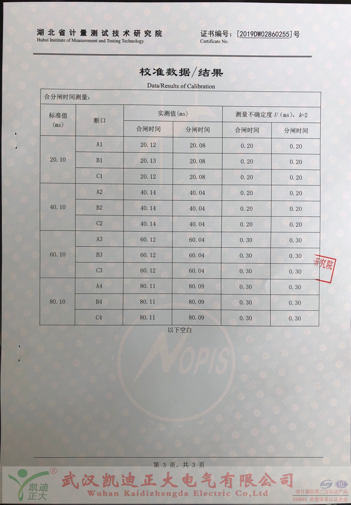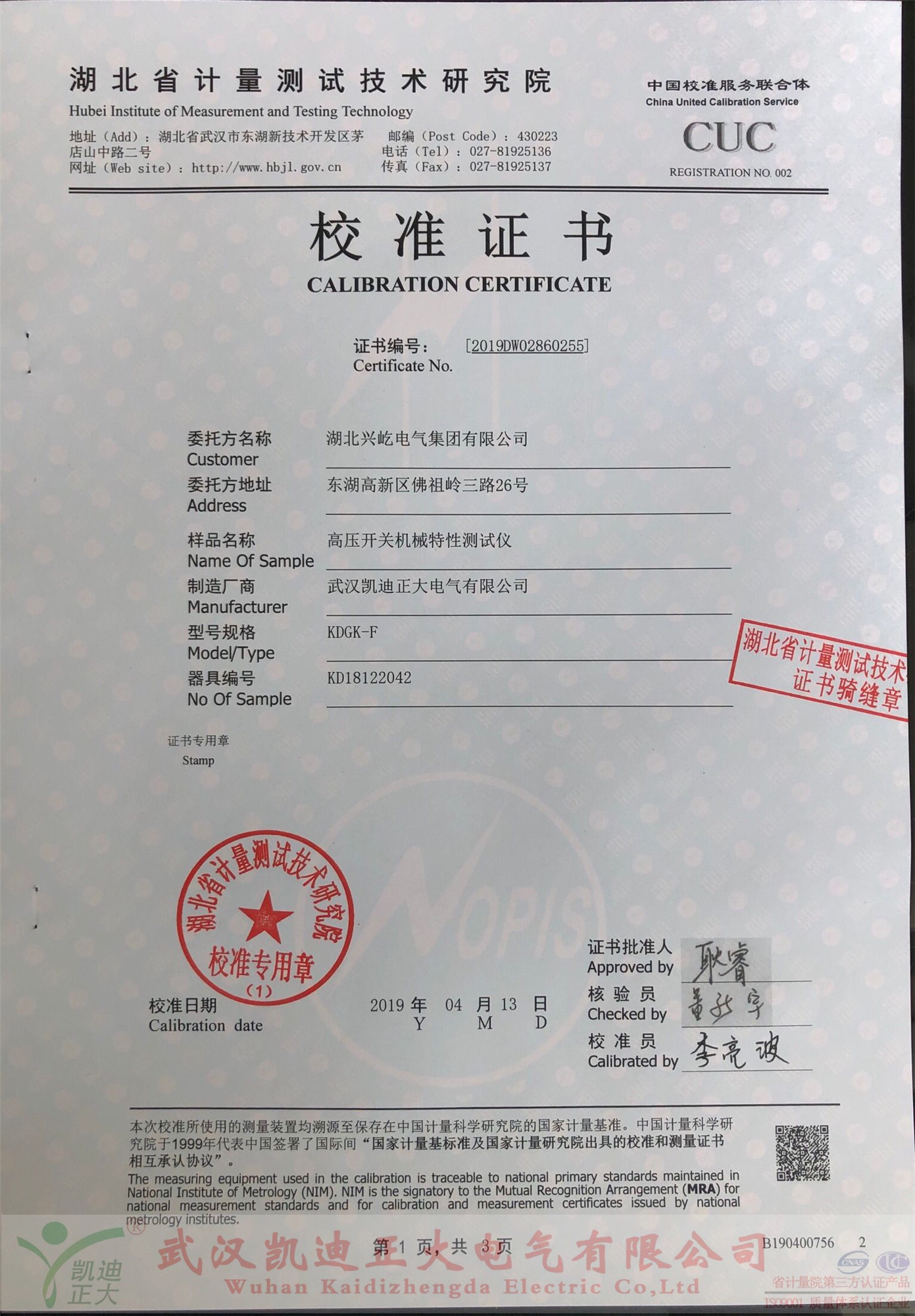 購買后便送往中國校準服務聯(lián)合體-湖北省計量測試技術(shù)研究院檢定,由省計量院出具的《校準證書》,證書編號:2019DW2860255,校準員:李亮波,檢驗員:董新宇,證書批準人:耿睿。