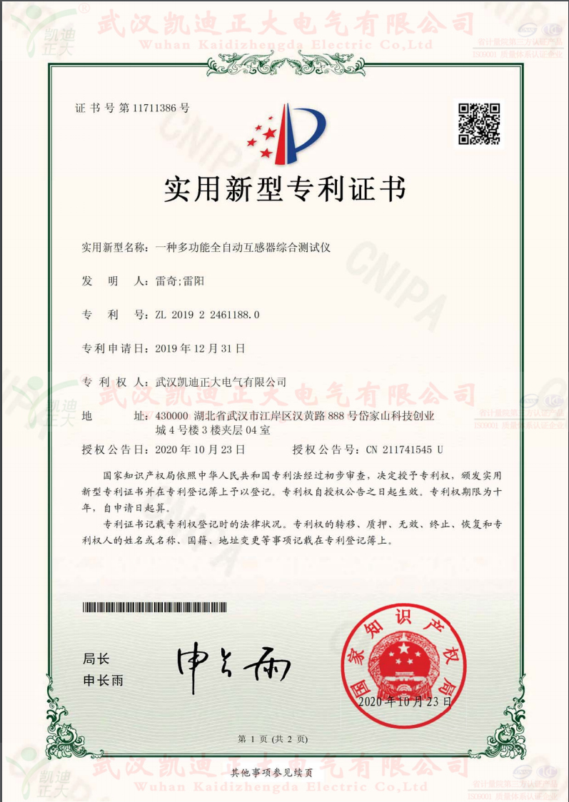 凱迪正大實(shí)用新型專利證書(shū):一種多功能自動(dòng)互感器綜合測(cè)試儀。