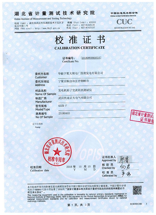 武漢凱迪正大KDZK-F發(fā)電機轉(zhuǎn)子交流阻抗測試儀校驗證書