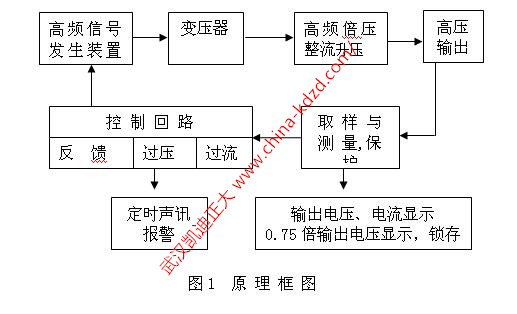 武漢凱迪正大KDZG系列直流高壓發(fā)生器采用中頻倍壓電路,率先應(yīng)用最新的PWM中頻脈寬調(diào)制技術(shù),閉環(huán)調(diào)整,采用了電壓大反饋,使電壓穩(wěn)定度大幅度提高。該發(fā)生器具有紋波系數(shù)小、輸出穩(wěn)定可靠,體積小、重量輕的特點,且具有可靠、靈敏的內(nèi)部保護功能,直流高壓發(fā)生器原理框圖如圖1所示。