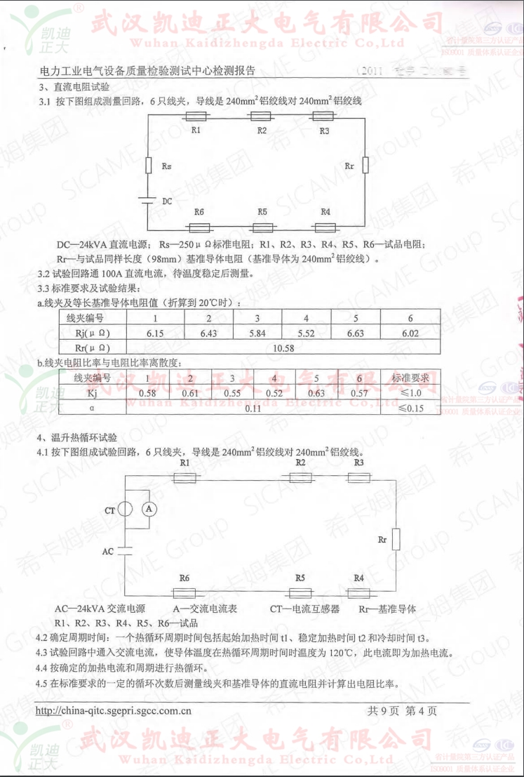 法國希卡姆集團(tuán)全資注冊的希瑪電力設(shè)備公司,2011年6月在武高所電力工業(yè)電氣設(shè)備質(zhì)量檢驗測試中心檢定H型線夾。檢測結(jié)論:根據(jù)DL/T765.1-2001對希瑪電力設(shè)備送檢的HC650型H形線夾進(jìn)行了尺寸和外觀檢查,結(jié)構(gòu)和組裝檢查,直流電阻試驗、溫升試驗、熱循環(huán)試驗、短路電流試驗和握力試驗,檢測項目合格。