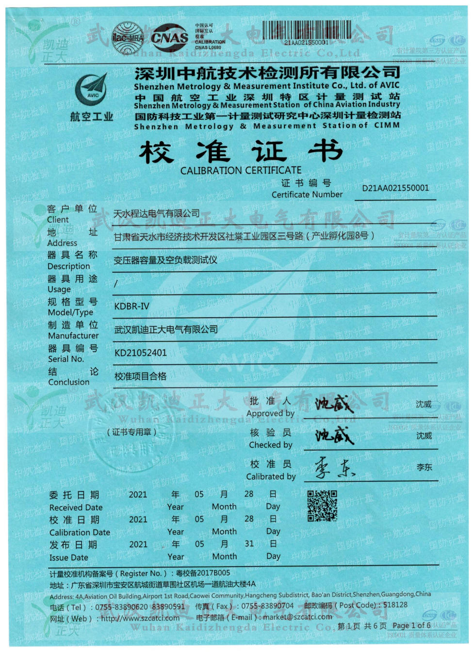 5月初,接市場(chǎng)部要求將KDBR-IV變壓器容量及特性測(cè)試儀送檢中國(guó)合格評(píng)定國(guó)家認(rèn)可委員會(huì)(CNAS)深圳中航技術(shù)檢測(cè)所檢定,獲得校準(zhǔn)合格證書(shū)。