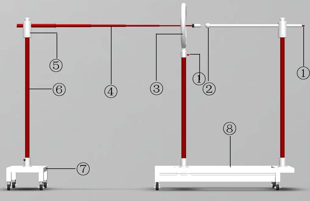 1.接線端子  2.均壓球  3.均壓環(huán)  4.驗(yàn)電器  5.固定器  6.絕緣管  7.平車(chē) 8.帶導(dǎo)軌平車(chē)