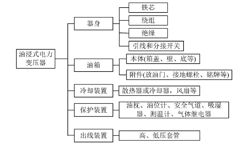 油浸式電力變壓器主要由器身、油箱、冷卻裝置、保護裝置、出線裝置等幾部分構(gòu)成,具體如圖所示: