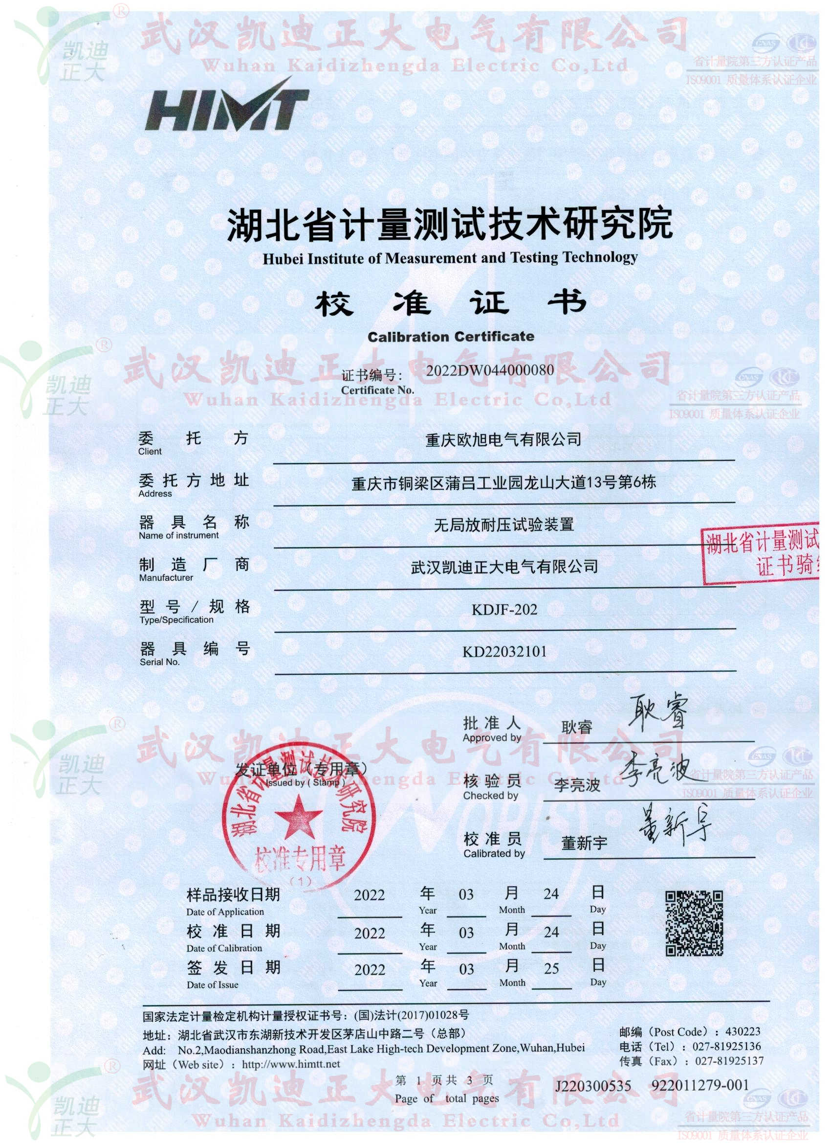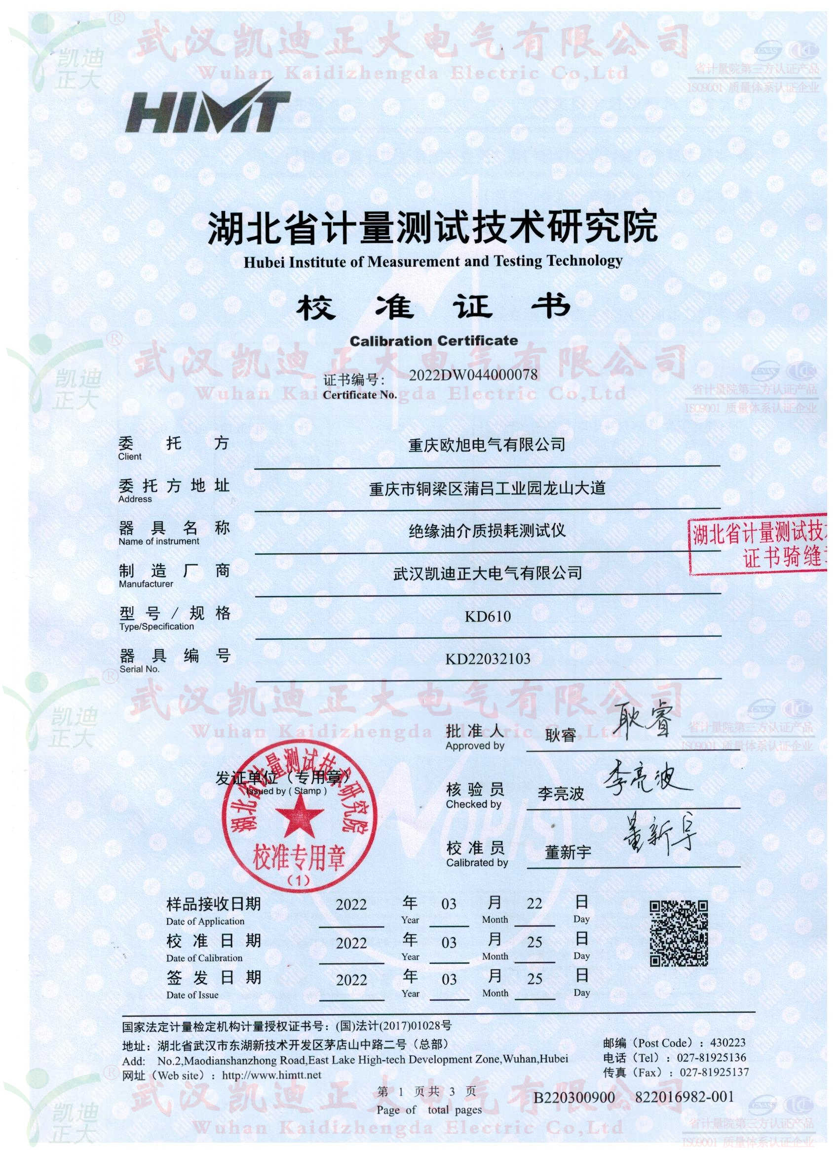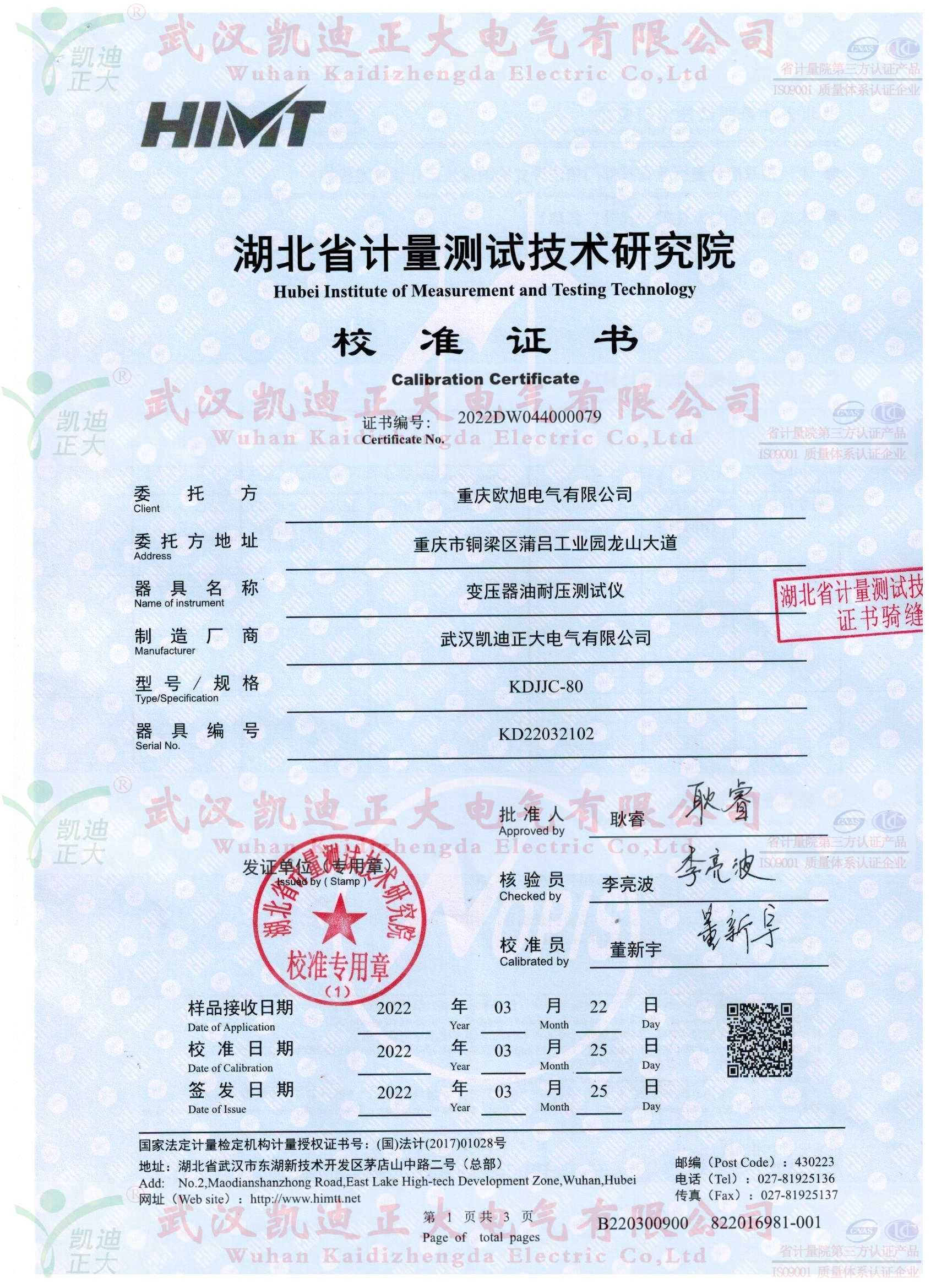 面對市場的優(yōu)劣淘汰趨勢,國網(wǎng)電力公司、南網(wǎng)等各電力企業(yè)對高標(biāo)準(zhǔn)的節(jié)能變壓器有強烈需求。出廠檢測設(shè)備是歐旭公司申請資質(zhì)需要的設(shè)備,在國內(nèi)優(yōu)質(zhì)變壓器檢測設(shè)備公司對比后,選擇我司KDJJC-80變壓器油耐壓測試儀、KD610絕緣油介質(zhì)損耗測試儀、KDJF-202無局放耐壓試驗裝置(10kVA/100kV)、KDZR-10A直流電阻測試儀等試驗設(shè)備。驗收標(biāo)準(zhǔn)已湖北省計量測試技術(shù)研究院校準(zhǔn)證書合格報告為基準(zhǔn),省計量院是政府計量行政管理部門依法設(shè)立的國家法定計量檢定機構(gòu)。校準(zhǔn)器溯源國家高電壓計量站(計)字第2021042100號。