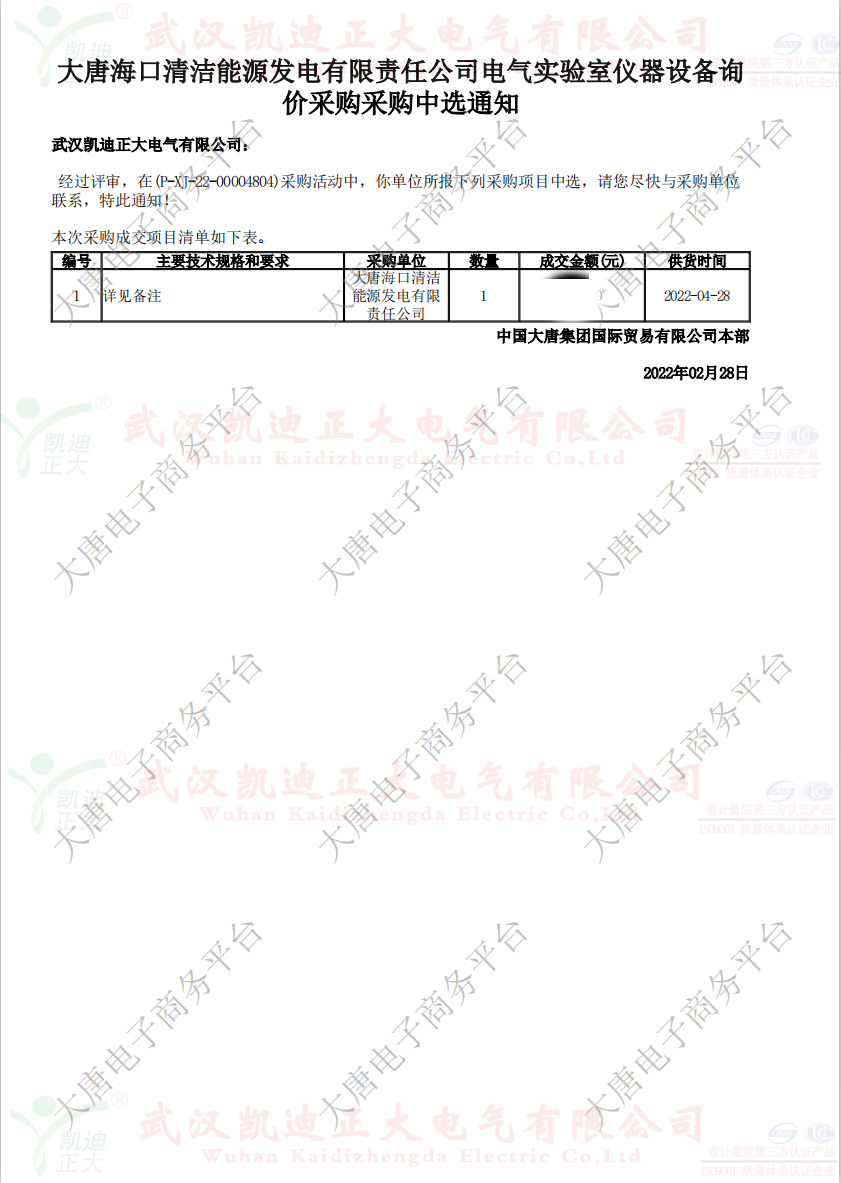 遲日江山麗,春風花草香。祝賀我司商務部再次接到中國大唐海口清潔能源發(fā)電有限責任公司電氣實驗室儀器設備詢價采購采購中選通知。
