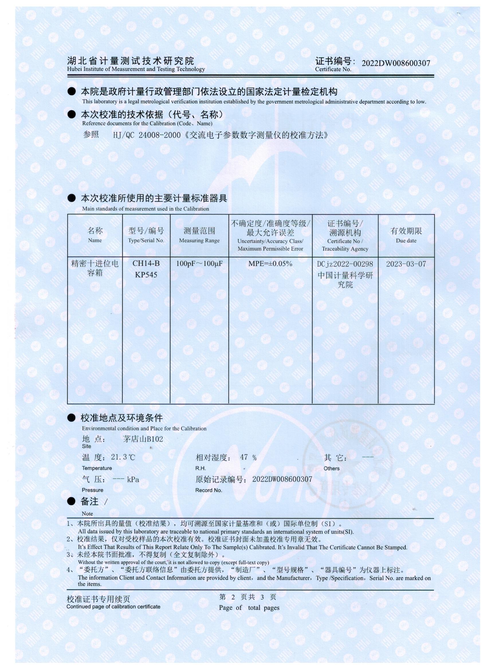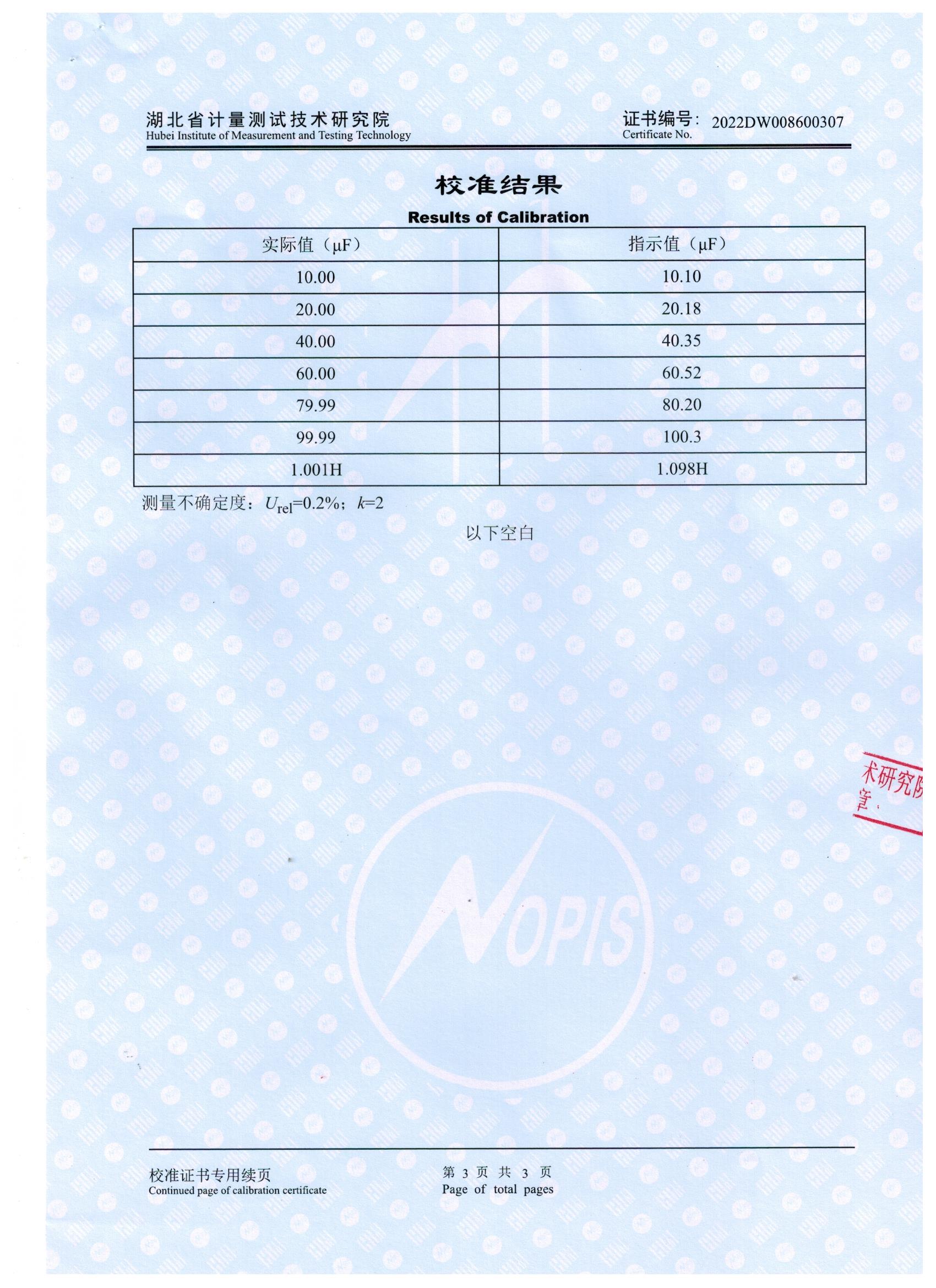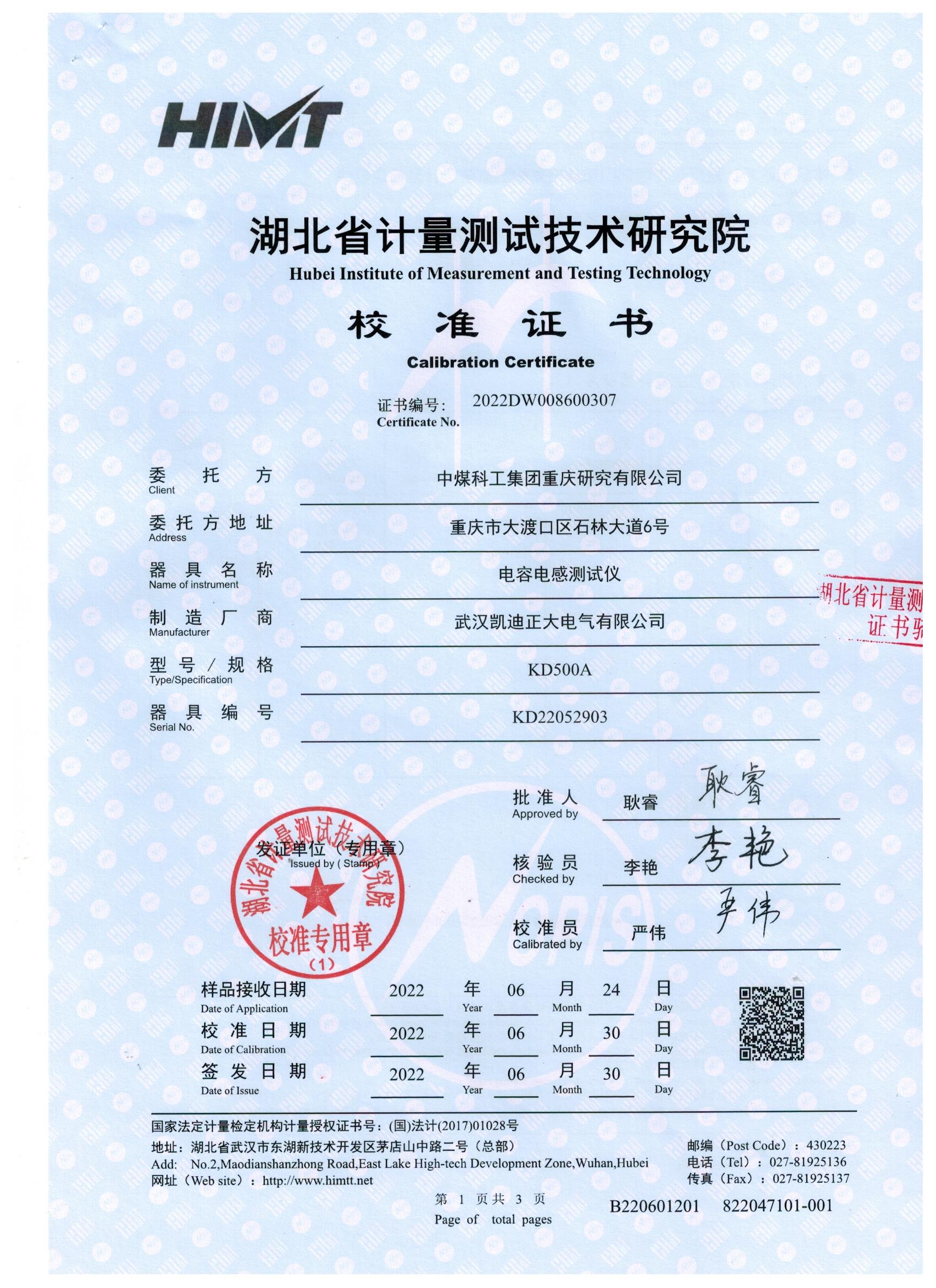KD500A電容電感測試儀榮獲湖北省計(jì)量測試技術(shù)研究院校準(zhǔn)證書