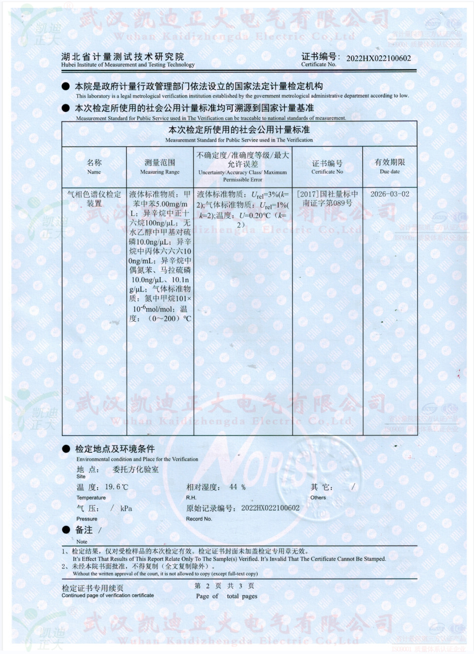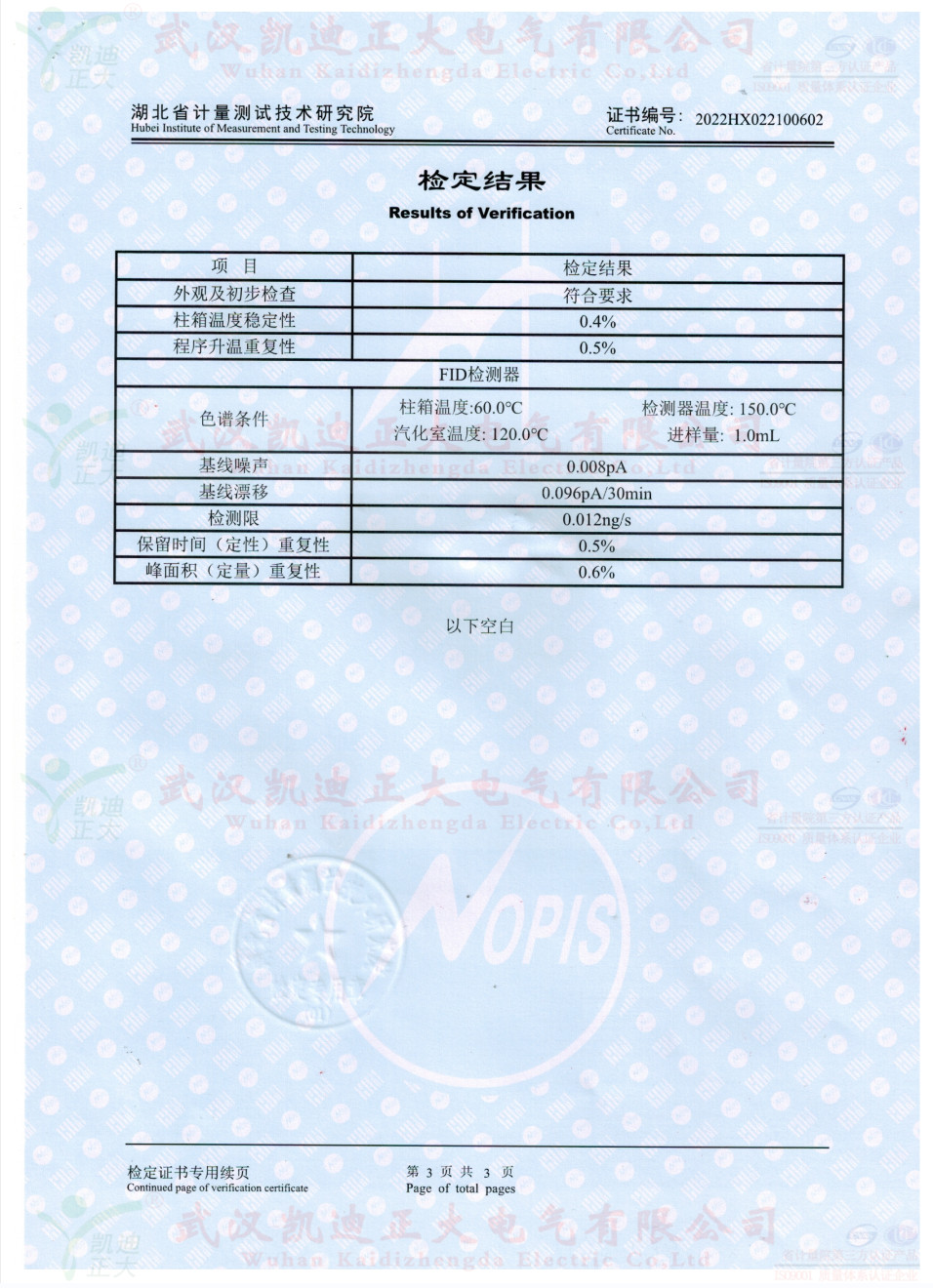 獲得國網(wǎng)湖北省電科院蔡工的青睞,了解了色譜儀的性能后,要求設(shè)備獲得湖北省計量院檢定報告。2022年10月,我司生產(chǎn)好KDZD9560氣相色譜儀后,按照JJG700-2016《氣相色譜儀檢定規(guī)程》進行送檢,檢定結(jié)果為合格。送檢單位電力工業(yè)電氣設(shè)備質(zhì)量檢驗測試中心,計量器具KDZD9560氣相色譜儀符合相關(guān)標準。