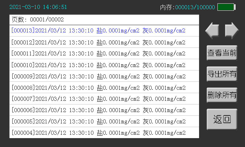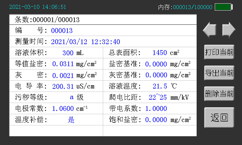 鹽密基準(zhǔn)值:在測(cè)量頁點(diǎn)“校準(zhǔn)”按鈕后會(huì)自動(dòng)保存溶液的初始鹽密值作為“鹽密基準(zhǔn)值”,也可以用戶自定義。