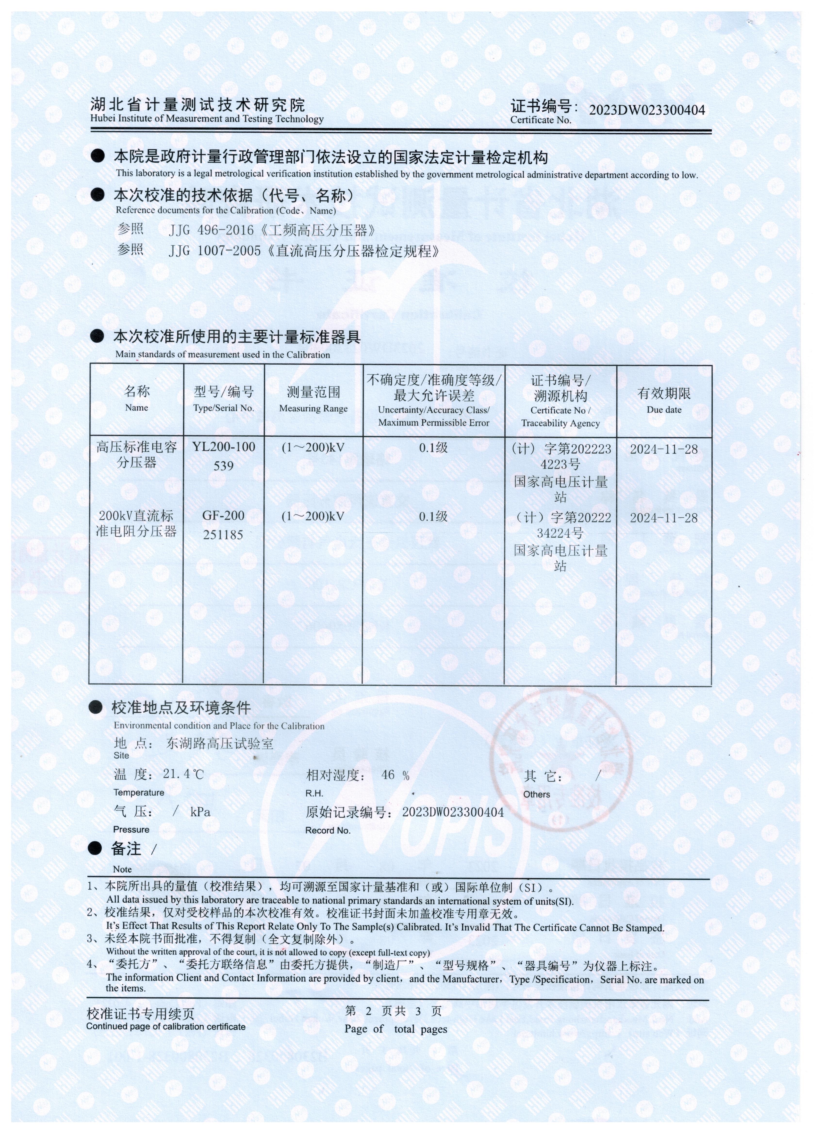 參照 JJG 496-2016 《工頻高壓分壓器》、JJG 1007-2005《直流高壓分壓器鑒定規(guī)程》 檢定要求,KDFCR-100 交直流兩用分壓器獲得證書2023DW023300404檢定證書。