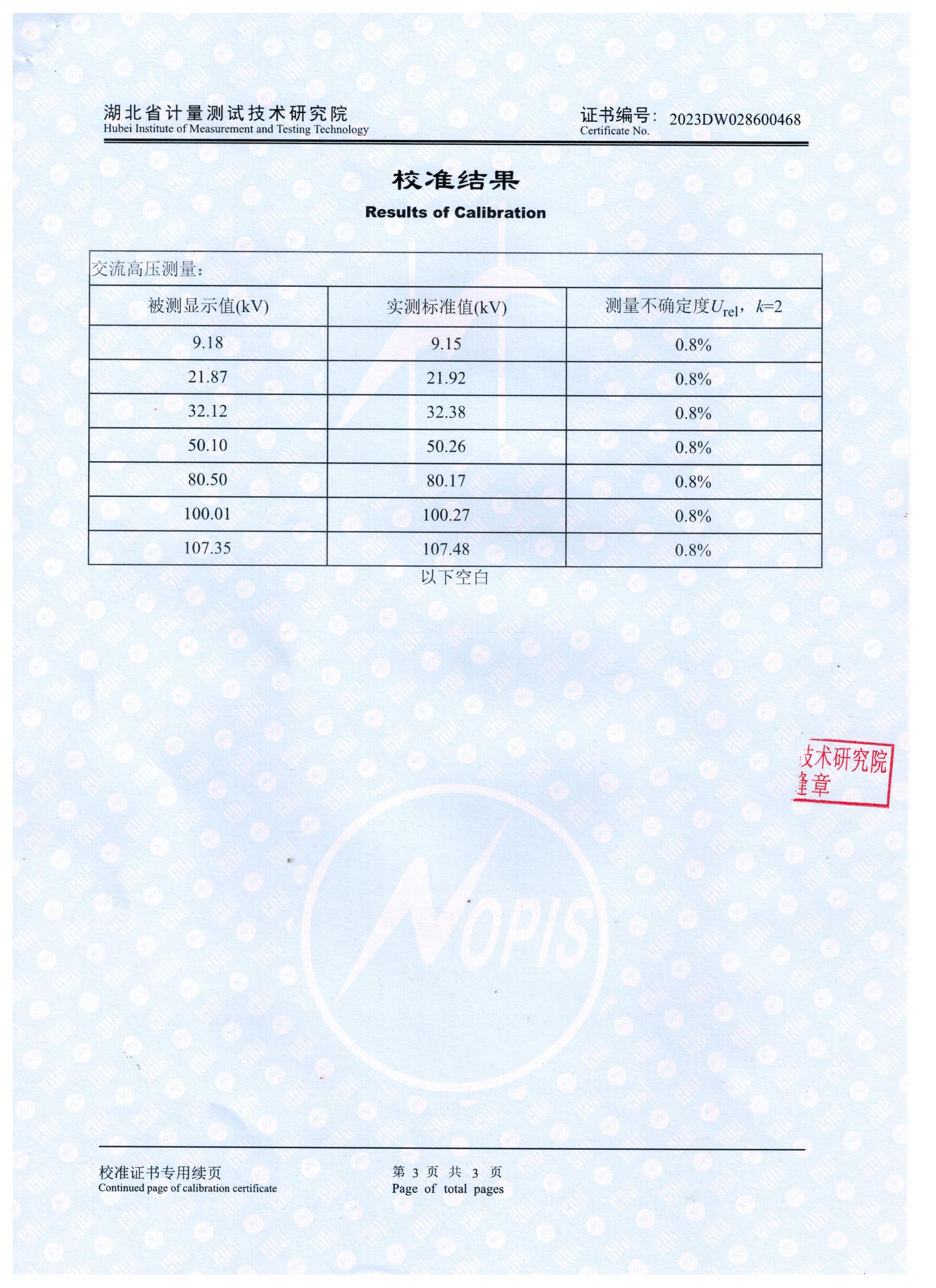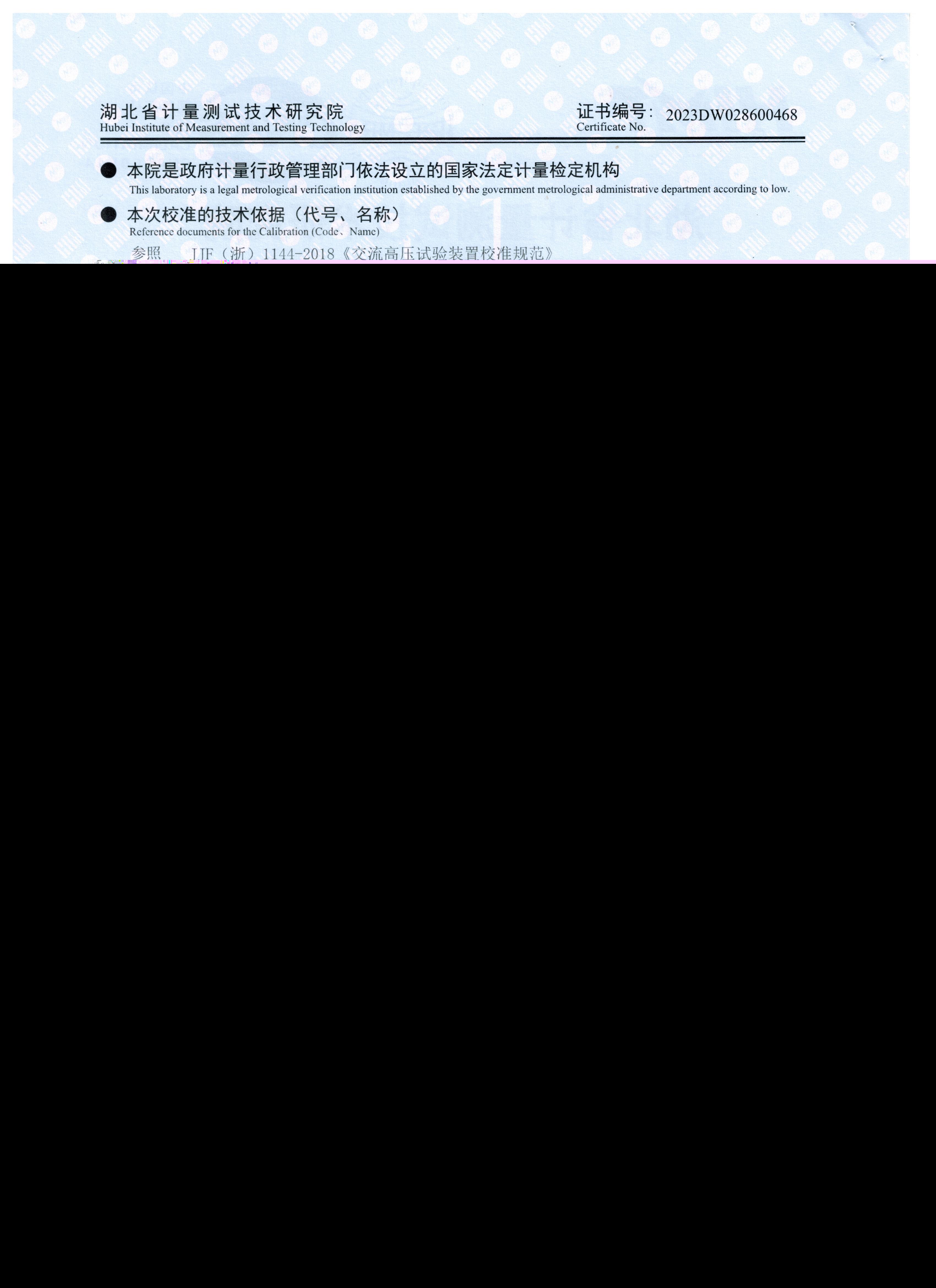 參照 JJG(浙)1144-2018《交流高壓試驗裝置校準(zhǔn)規(guī)范》 檢定要求,KDXZ-II-108kVA/108kV 變頻串聯(lián)諧振試驗裝置獲得2023DW028600468檢定證書。