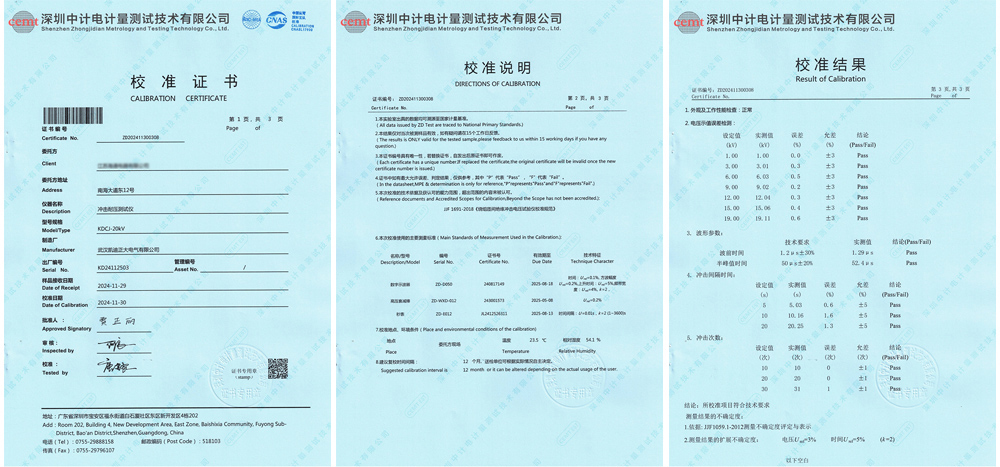 江蘇某電器有限公司采購武漢凱迪正大電氣有限公司的KDCJ-20kV沖擊耐壓測試儀、KDYD-FD放電試驗裝置、KDYD-ZY噪聲測試平衡負(fù)載系統(tǒng)、KD-IP2C防護(hù)等級試驗棒,通過深圳中計電計量測試技術(shù)有限公司的校準(zhǔn),并拿到校準(zhǔn)報告。