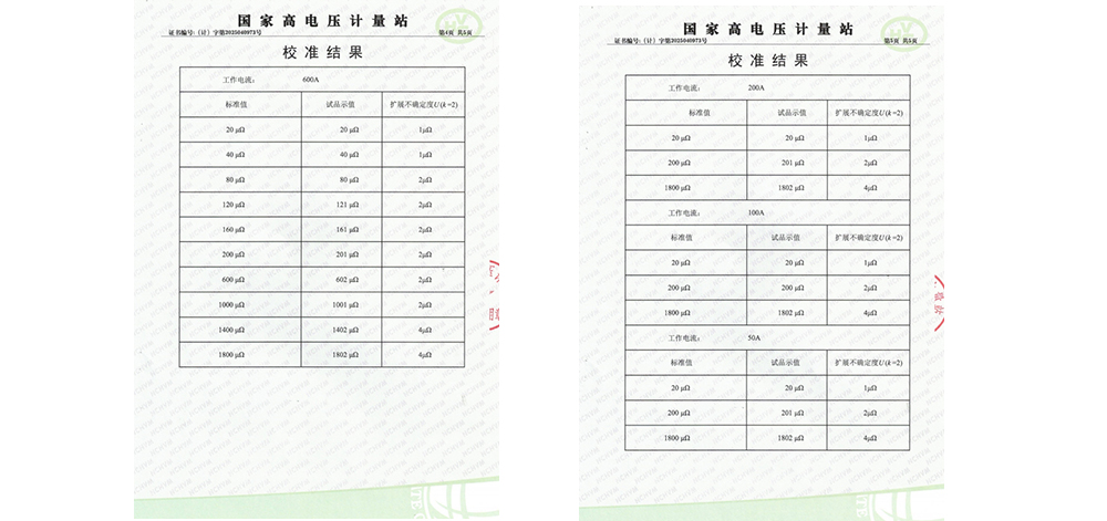 在校準(zhǔn)過程中,國家高電壓計(jì)量站采用了最大充許誤差為±0.1%讀數(shù)的直流大功率標(biāo)準(zhǔn)電阻作為校準(zhǔn)器具,校準(zhǔn)環(huán)境為溫度21℃℃、濕度56%RH。校準(zhǔn)內(nèi)容包括對測試儀在600A、200A、100A、50A不同電流下的測量結(jié)果。經(jīng)過一系列嚴(yán)格的測試和比對,KDHL-600A回路電阻測試儀成功通過了校準(zhǔn)。