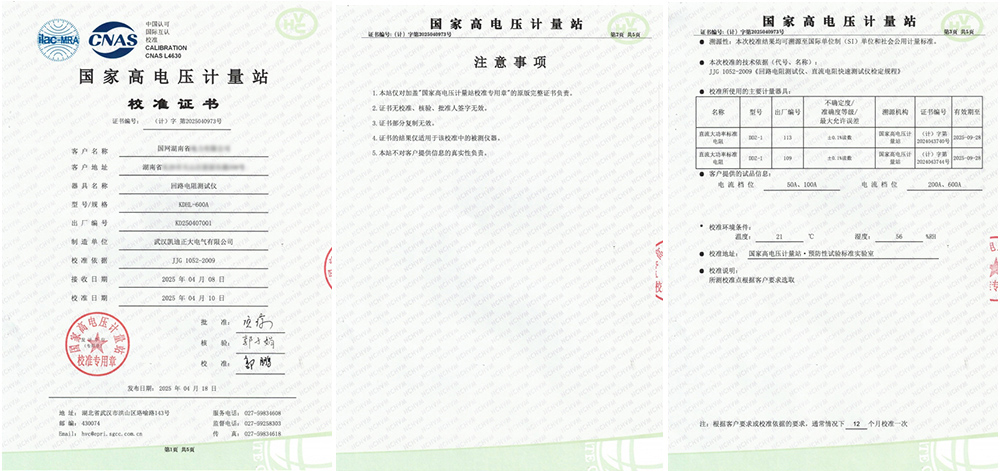近日,國網(wǎng)湖南省某有限公司采購的武漢凱迪正大KDHL-600A回路電阻測試儀,順利通過了國家高電壓計(jì)量站的嚴(yán)格校準(zhǔn),并獲得了校準(zhǔn)證書。