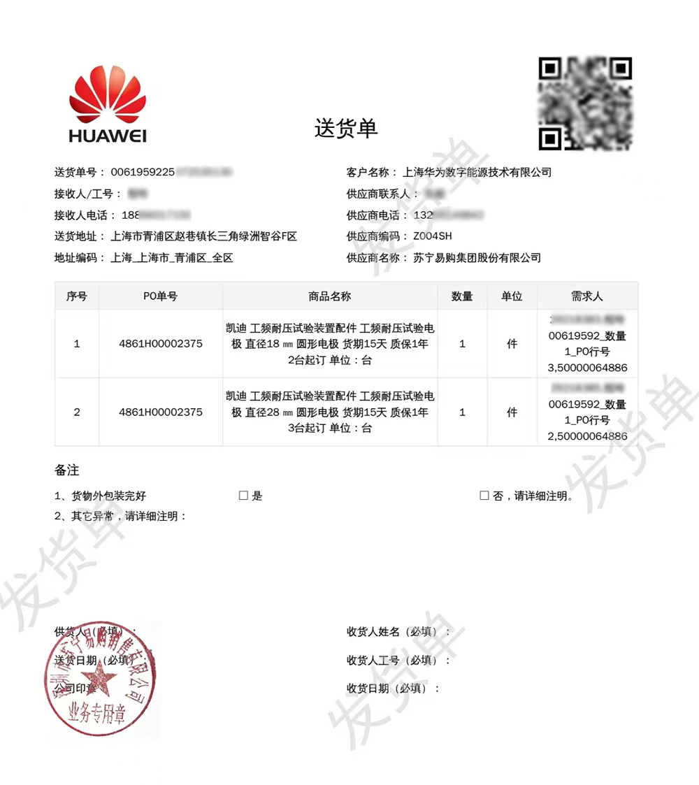 能夠?yàn)樯虾HA為數(shù)字能源技術(shù)有限公司供貨,充分彰顯了武漢凱迪正大的實(shí)力。華為在供應(yīng)商選擇上有著嚴(yán)格的標(biāo)準(zhǔn),對(duì)產(chǎn)品的質(zhì)量、技術(shù)性能、可靠性等方面都有著高要求。武漢凱迪正大憑借其在工頻耐壓試驗(yàn)裝置及電極領(lǐng)域多年的技術(shù)積累、成熟的生產(chǎn)工藝和完善的質(zhì)量管理體系,通過了華為嚴(yán)格的供應(yīng)商資質(zhì)審核。公司不僅擁有生產(chǎn)設(shè)備和檢測(cè)儀器,還建立了一支專業(yè)的研發(fā)團(tuán)隊(duì),持續(xù)進(jìn)行技術(shù)創(chuàng)新和產(chǎn)品升級(jí),以滿足市場(chǎng)不斷變化的需求。