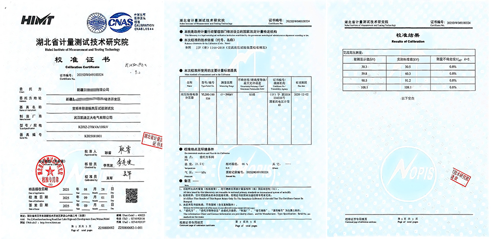 近期,新疆某能源公司采購了由武漢凱迪正大電氣有限公司生產(chǎn)的KDXZ-270kVA/108kV變頻串聯(lián)諧振試驗(yàn)裝置。該設(shè)備經(jīng)湖北省計(jì)量測試技術(shù)研究院(省計(jì)量院)校準(zhǔn)并頒發(fā)證書(證書編號:2025DW049100324),此次校準(zhǔn)不僅標(biāo)志著該設(shè)備各項(xiàng)性能指標(biāo)符合行業(yè)規(guī)范要求,更凸顯了武漢凱迪正大在高壓電氣檢測設(shè)備領(lǐng)域的技術(shù)實(shí)力。