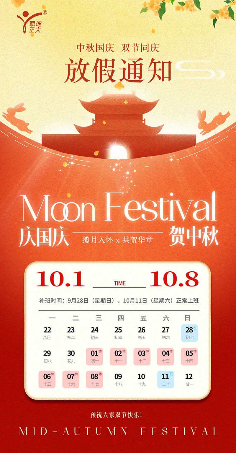 凱迪正大電氣2025年國慶中秋放假通知: 根據國家法定節(jié)假日安排,結合公司實際情況,現將2025年國慶節(jié)、中秋節(jié)放假事宜通知如下: