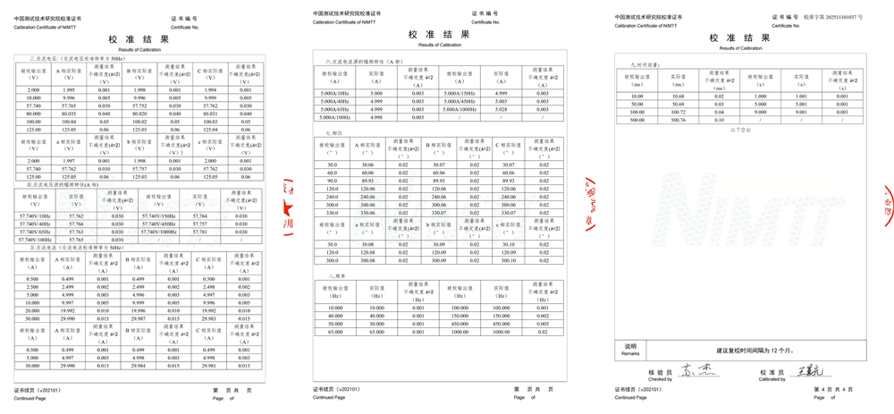 校準(zhǔn)內(nèi)容全面覆蓋了繼電保護(hù)測(cè)試儀的所有核心功能,具體結(jié)果彰顯了儀器的高精度與穩(wěn)定性: